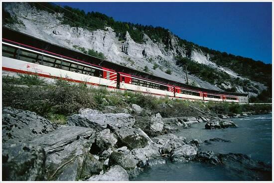 RHAETISCHE BAHN/RhB - Glacier Express Glacier Express mit Panowagen bei Trin. Glacier Express with panorama coaches by Trin. Copyright by Rhaetische Bahn By-line: swiss-image.ch