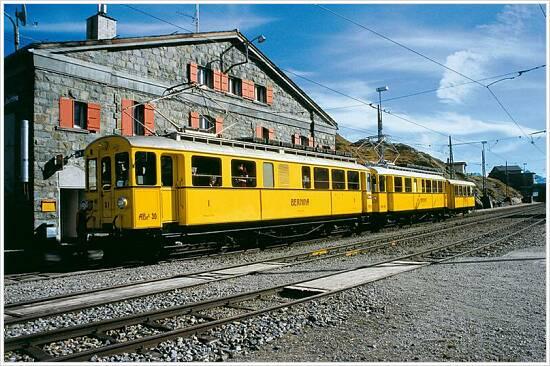 RHAETISCHE BAHN/RhB - 'La Bucunada': Historische, gelbe Komposition der Berninabahn mit zwei Triebwagen und C114 'La Bucunada' in Ospizio Bernina.