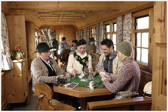 |  | RHAETISCHE BAHN/RhB - Stiva Retica: Wer in der Stiva retica sitzt, hat die Weichen fuer eine gute Stimmung schon gestellt, denn im Buendner Fichtenholz-Stuebli geht's rund zu und her.