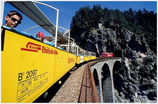 RHAETISCHE BAHN/RhB - Railrider: In den offenen Aussichtswagen des Railrider ueber den Landwasserviadukt. Railrider: In the open couches of the Railrider over the land water viaduct. Copyright by Rhaetische Bahn By-line: RhB/swiss-image.ch