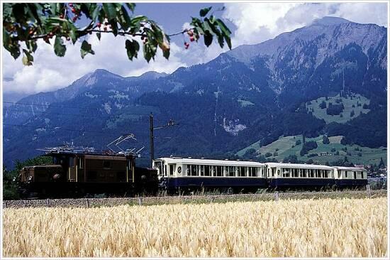 |  | RHAETISCHE BAHN/RhB - Wie eine Spielzeugbahn muten Krokodillok und Wagen des Alpine Alpine Classic Pullmann-Express auf den Viadukten, Bruecken und zwischen den Kornfeldern an (bei Malans in der Buendner Herrschaft).