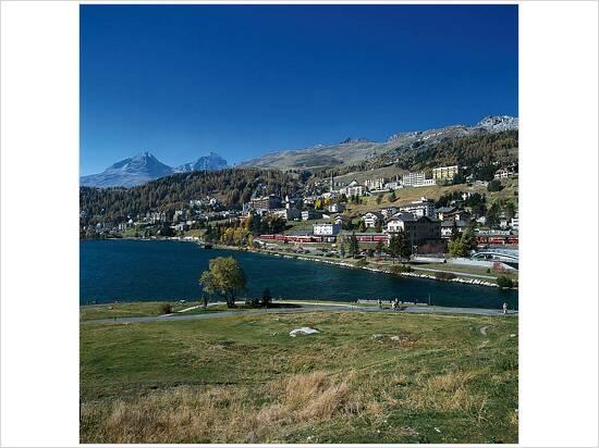 RHAETISCHE BAHN/RhB - St. Moritz; Bahnhof mit Piz Albana, Piz Gueglia und St. Moritzersee. St. Moritz - Station with Piz Albana, Piz Gueglia an the lake of St. Moritz. Copyright by Rhaetische Bahn By-line: swiss-image.ch
